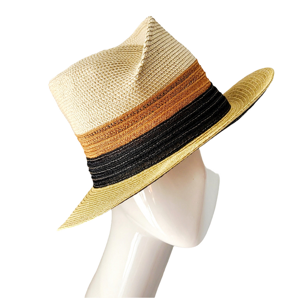 Straw hat with a black band on a mannequin head against a white background